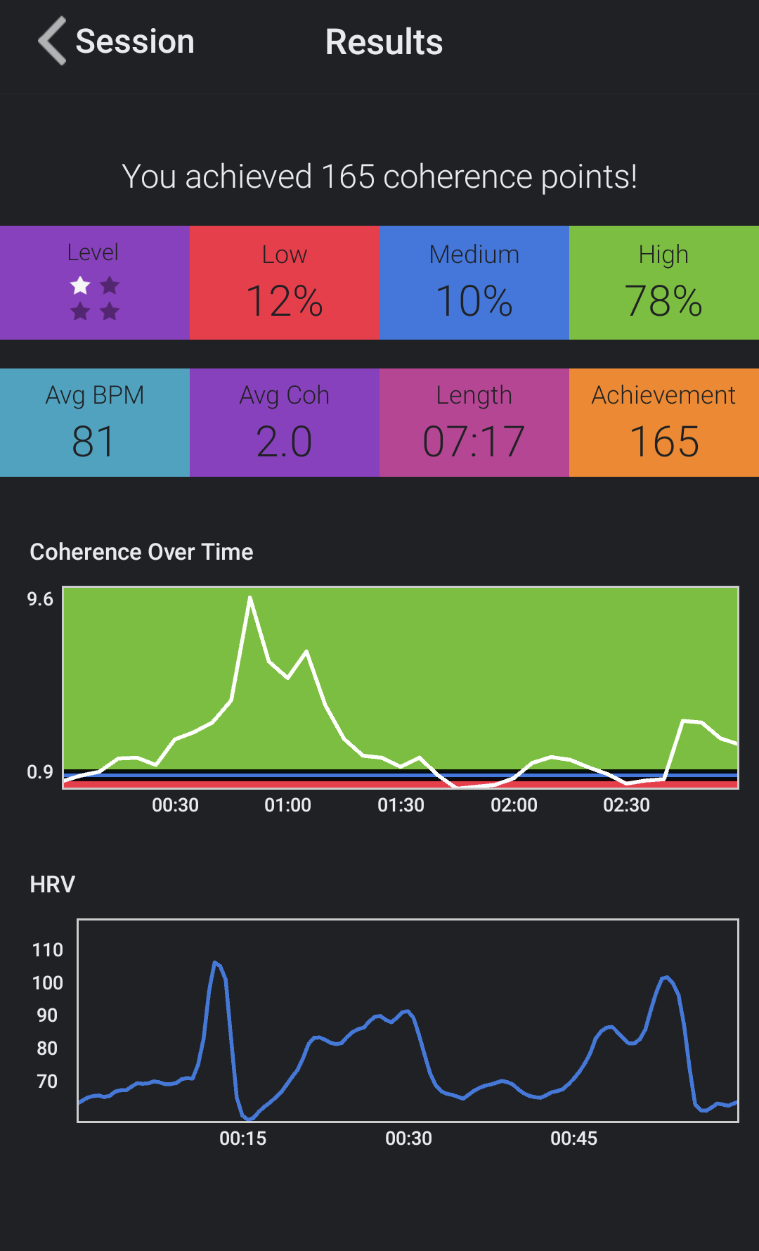 Tijdens de hypnotische visualisatie werd haar coherentie stabieler. De lijn in de grafiek bleef langer in het groene gebied.